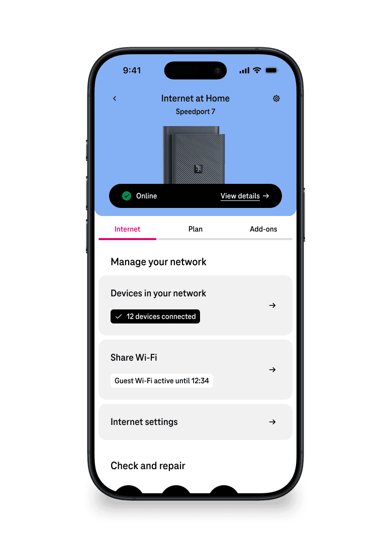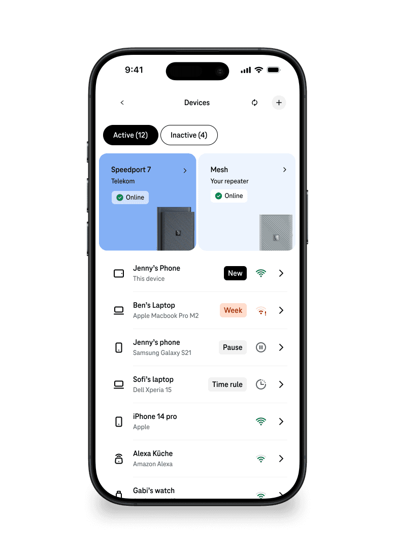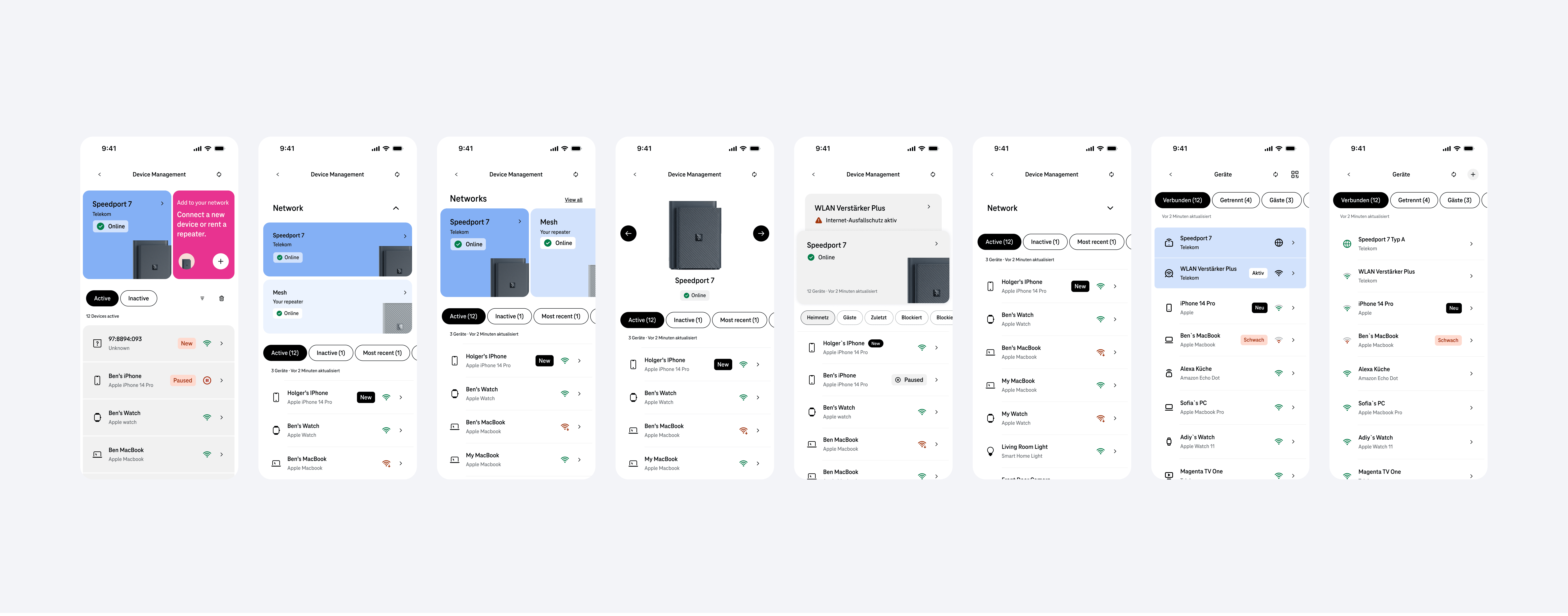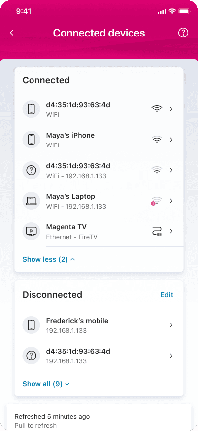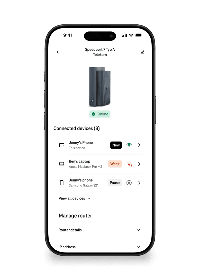 Deutsche Telekom's OneApp is the primary interface for 5M+ broadband customers to manage their home network. The device management section let customers see every device connected to their router — phones, laptops, TVs, smart home products.